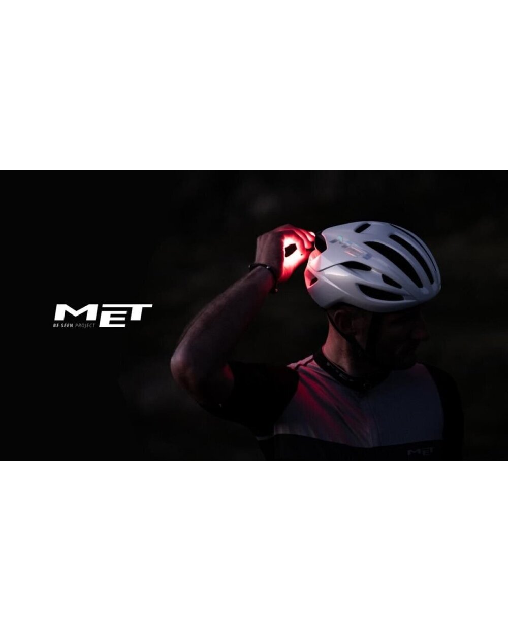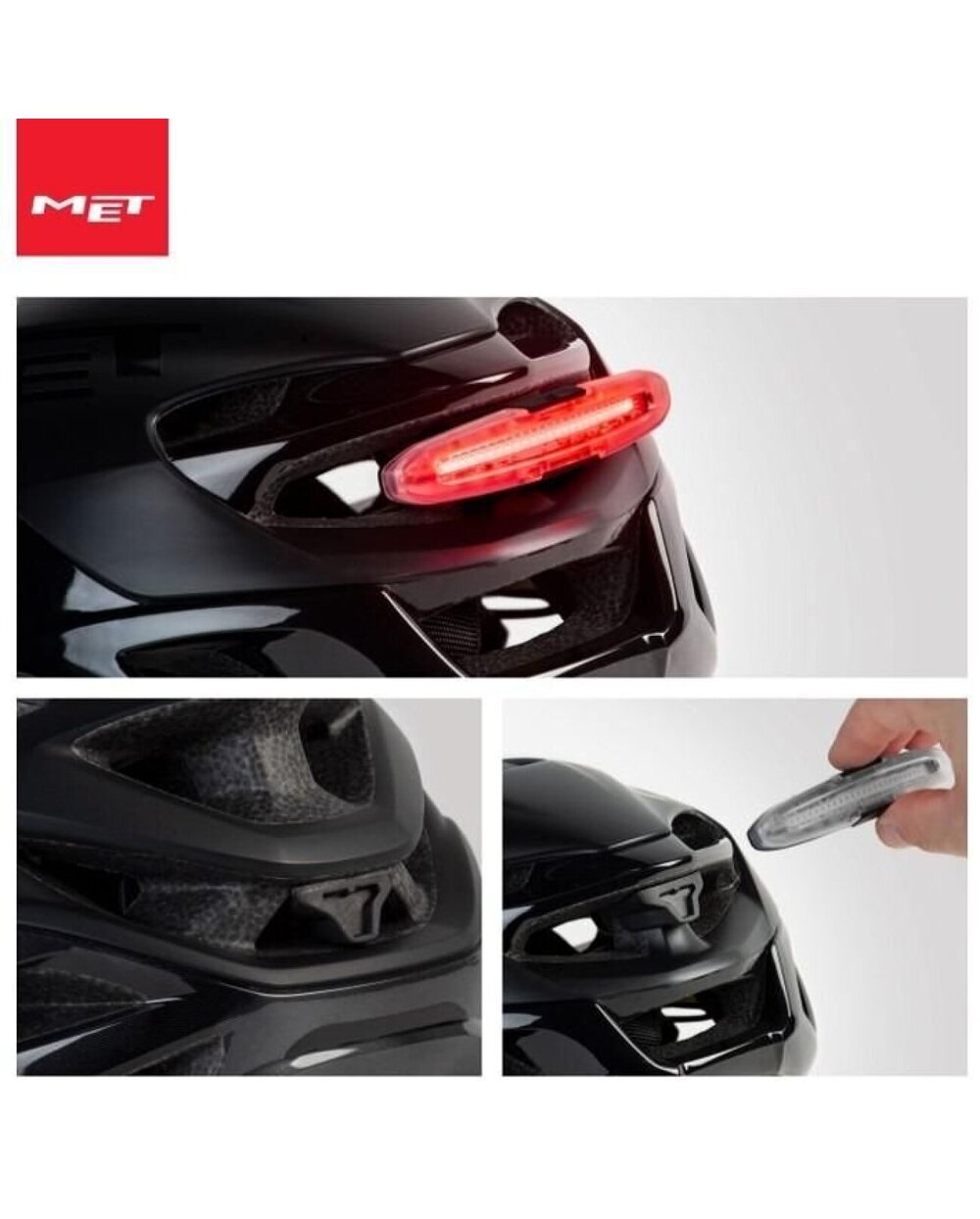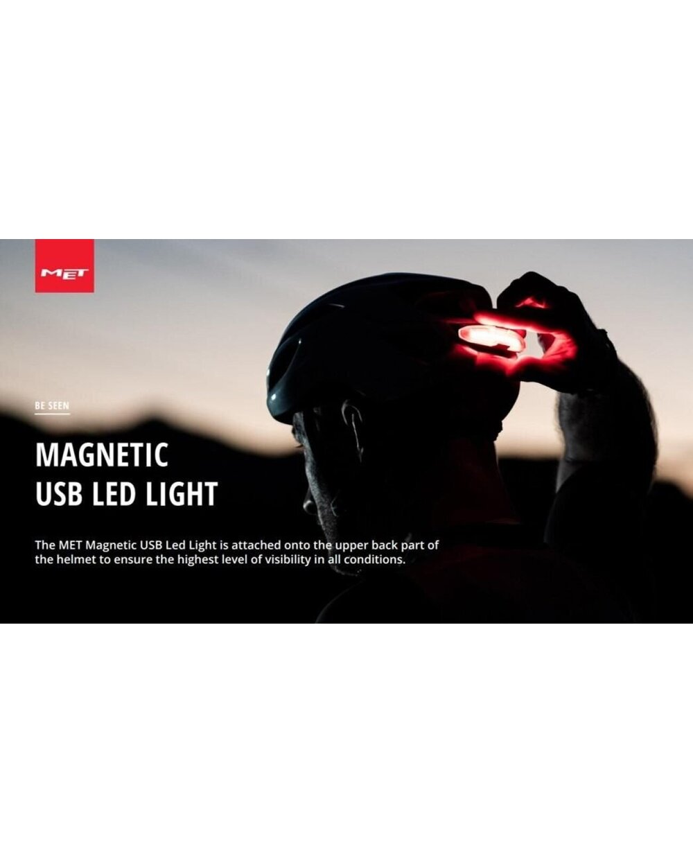 Lumina LED magnetică USB MET este atașată la spatele căștii și asigură vizibilitatea în toate condițiile.