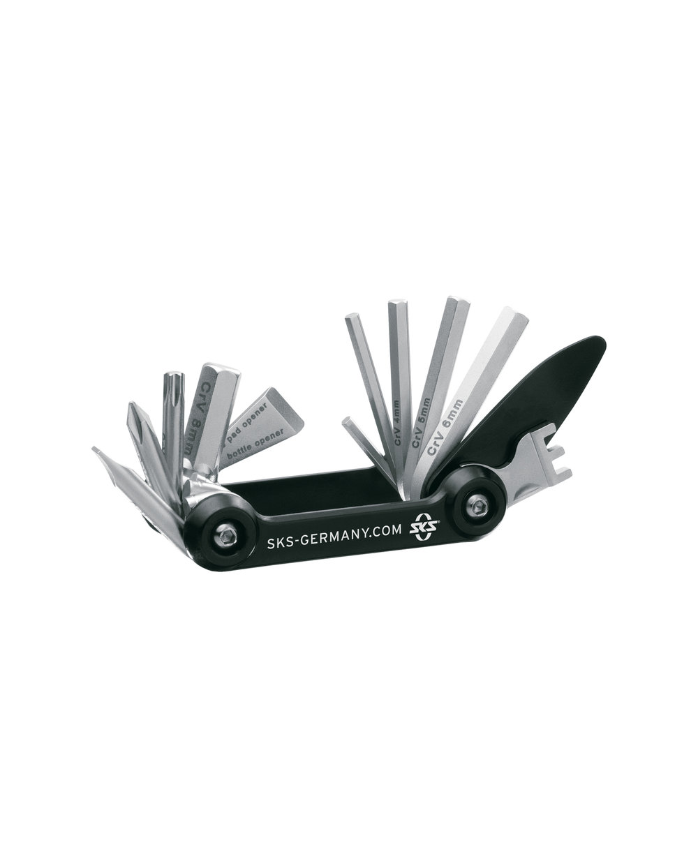 SKS TOM 14 este o unealtă ușoară și compactă cu 14 funcții. Bucățele: 2,5 / 3 / 3 / 4 / 5 / 6 / 8 mm Culozetă cu cap răsucit și cu cap plat TORX T25 1 levier de montare Cleșă G14/G15 Deschizător de sticle .