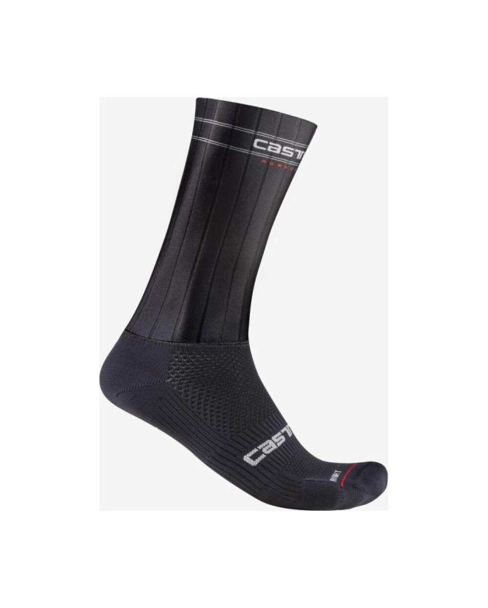 Există multe șosete cu atributul „aero” pe piață. Dar șosetele Fast Feet de la CASTELLI au fost supuse unor dezvoltări și testări care confirmă valabilitatea unui astfel de atribut. Puținele modele care au fost testate probabil au trecut prin testul nemișcat, static, pentru că asta este mai ușor. Cu toate acestea, piciorul este în permanentă mișcare, așa că am inventat un dispozitiv care imită mișcarea piciorului și a piciorului. Verificăm rezultatele testând pe călăreți. Acești șosete vă pot economisi 2 wați la o viteză de 50 km/h. Cea mai recentă versiune are o manșetă îmbunătățită pentru mai mult confort și aerodinamică