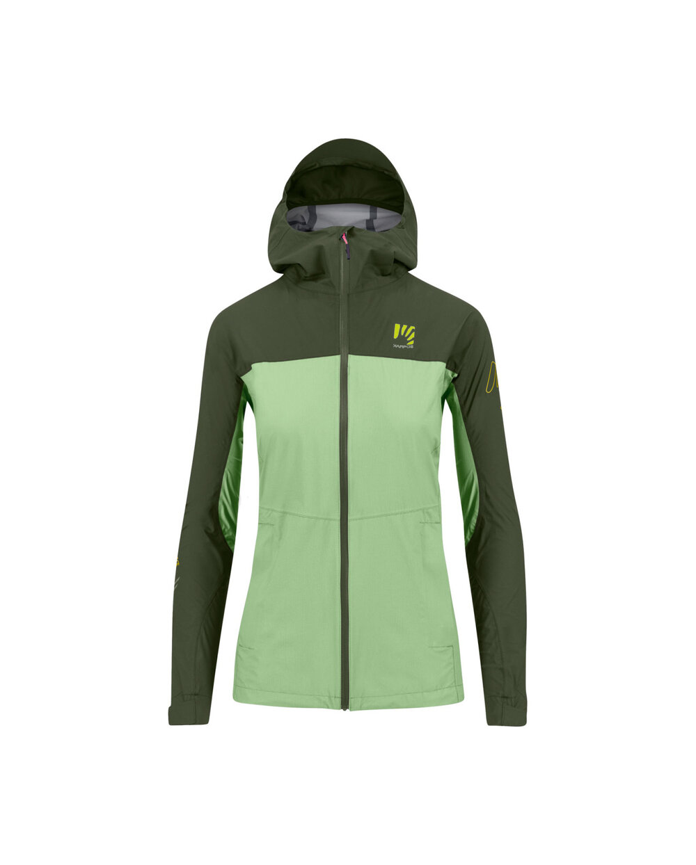 Două buzunare frontale cu fermoare YKK® rezistente la apă asigură depozitarea în siguranță a obiectelor mici chiar și pe vreme rea. Buzunarul din dreapta este echipat suplimentar cu fermoar în două direcții și servește și ca acoperire pentru împachetarea jachetei în dimensiuni mici.